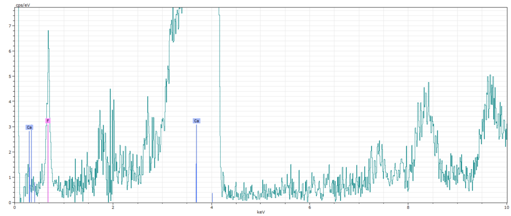 The fluorite-bearing sample was scanned under a vacuum of 2mbar, with a pixel size of 40µm and a dwell time of 30ms per pixel. The spectra for an area within fluorite is displayed below (figure 3a), showcasing fluorine and calcium spectral peaks. This spectrum translates into a fluorine map shown in figure 3b.